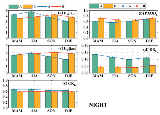 Seasonal variation in the optical properties of the aerosol layer over Africa at night from 2007 to 2019. (a) HH, (b) PAODL, (c) HL, (d) DRL, and (e) CRL (A: plains area; B: highland area).