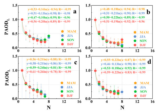 We analyzed the correlations of aerosol properties over Africa. Figure 14 depicts the correlation between N and PAODL over Africa. Results showed that N and PAODL values all had significant negative correlations over A and B at daytime and nighttime. The larger the N, the smaller the PAODL. Therefore, the greater the number of layers, the lower the proportion of the lowest aerosol layer’s AOD; i.e., PAODL values became smaller. Our results were consistent with the results of existing studies [52,53].