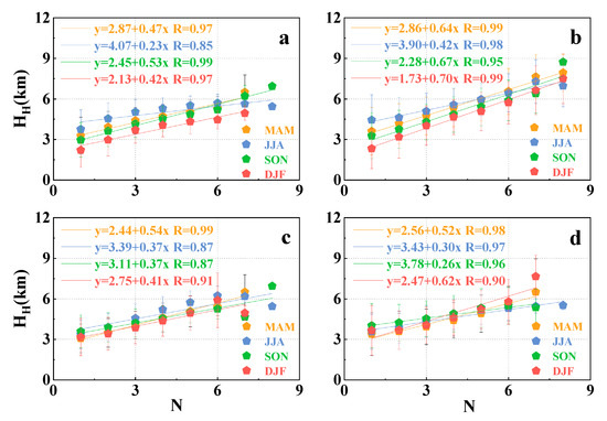 Figure 15 depicts the correlation between N and HH over Africa. As shown, N and HH had strong positive correlations in all regions at daytime and nighttime. The higher the HH, the greater the N values. Because more aerosol layers were generally due to strong atmospheric vertical convection, leading to liftings of the aerosol layers, the top heights of the highest aerosol layers increased. At the same time, the more frequent the aerosol stratifications, the greater the number of aerosol layers. This result was consistent with the existing knowledge reported for the Yellow River Basin and the Tibetan Plateau [52,54].