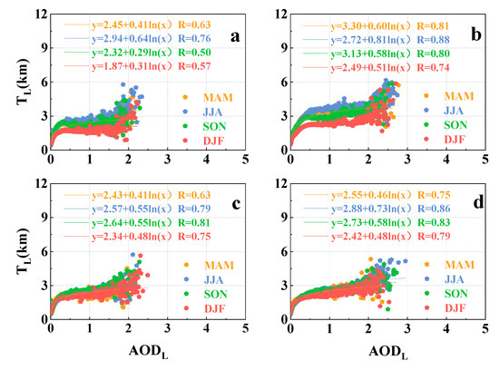 Figure 16 depicts more significant positive correlations between AODL and TL. The thicker the aerosol layers, the greater their light obstruction, i.e., the aerosol layers’ optical thickness increased. Similar findings have been observed in the Pakistan region and Tibet [52,53].