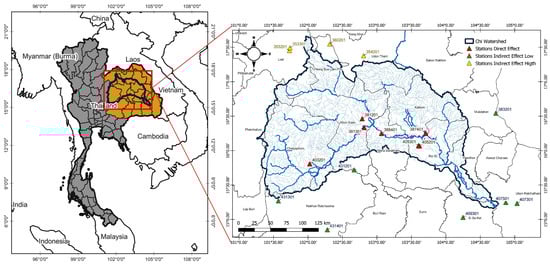 This study focuses on the Chi watershed in Thailand, which is depicted in Figure 1. The watershed is represented by the dark green line and is situated in the northeastern region of Thailand, spanning between the latitudes of N to N and longitudes of E to E (WCPC []). The watershed covers a total area of 49,131.92 km, with the majority of the area located in 14 provinces.