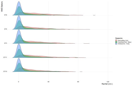 This study utilized weekly moving Cumulative Rainfall (WMCR) data obtained from the Thailand Meteorological Department (TMD) using maximum daily rainfall (MDR) from 1990 to 2021 []. The maximum WMCR values for all stations ranged from 145.90 to 274.50 mm., while the average WMCR ranged from 18.39 to 27.80 mm. The station ID, name, provincial area, latitude, longitude, and descriptive statistics for each station are provided in Tables S1 and S2 in the Supplementary Material. To provide a clearer picture, the ridgeline plots of WMCR by season in Thailand for five directly affected stations in the Chi Watershed is presented in Figure 2.