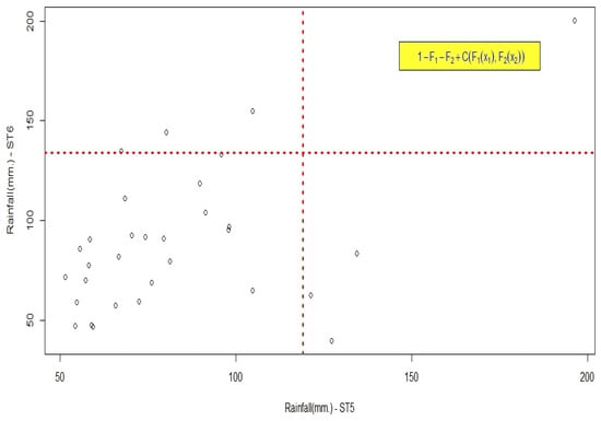 where indicates the mean inter-arrival time of the two consecutive extreme events. and are specific values of and , respectively; and ; and are the cumulative distribution function (CDF) which the Figure 3 shows clearly about the risk area concept. In addition, small circles are scatter points of rainfall(mm.) between ST5 and ST6, dash lines are threshold for 95% quantile rainfall(mm.) for both stations are shown in Figure 3.