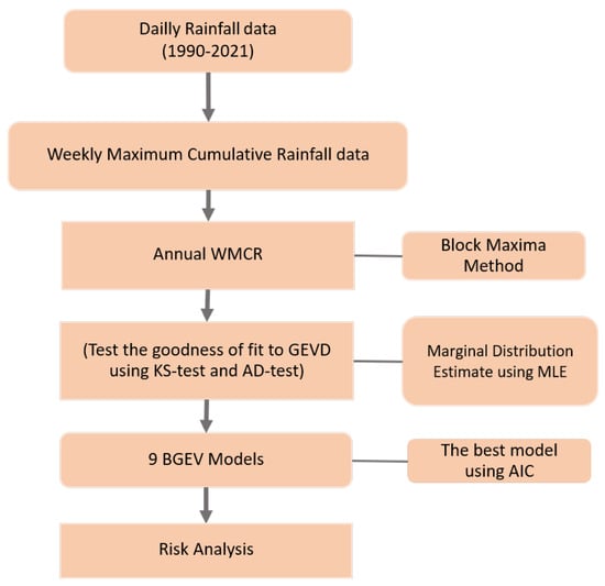 In this section, we describe the methodology used for our analysis, which involved organizing the weekly moving cumulative rainfall (WMCR) data into two separate data frames. We then applied the maximum annual WMCR to either a block maxima model or a generalized extreme value (GEV) distribution. We chose these models because the performance of each bivariate copula extreme analysis varies.
