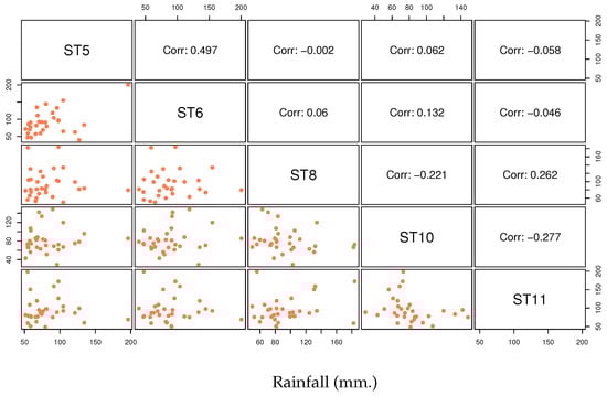 The Annual Maximum Weekly Moving Cumulative Rainfall (AMWMCR) data are presented in the following Figure 5. The Kendall tau correlation is also estimated and compared with estimates of extreme dependence. For convenience, the estimated Kendall tau is presented in the corresponding sub-sections and shows 5 stations that are directly affected in the Chi Watershed, Thailand. Approaches suggested to interpreting the correlation coefficient range is between −1 to 1. We provide three categories; (1) 0.01 to 0.39 is a weak positive correlation,( 2) 0.40 to 0.69 is a medium positive correlation and (3) 0.7 to 1.00 is a strong positive correlation []. On the contrary, (1) −0.01 to −0.39 is a weak negative correlation, (2) −0.40 to −0.69 is a medium negative correlation and (3) −0.7 to −1.00 is a strong negative correlation.