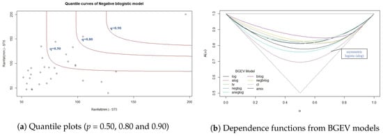 Quantile plots (p = 0.50, 0.80 and 0.90) and dependence functions from BGEV model fits at ST5–ST6.