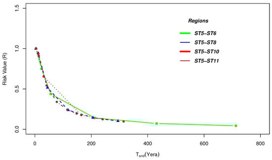 Table 2, shows the bivariate joint return period ( (Years)), and the risk value which is the probability of extreme rainfall in each pair of meteorological stations. The results indicate extreme rainfall by region analyzed the risk of flooding over a range of return periods, including 2, 5, 10, 25, 50, and 100 years, and plotted the corresponding probabilities of exceedance, as shown in Figure 7. Taking the region ST5–ST11 as an example, in the 100-year return periods the estimate of rainfall in ST5 and ST11 are 186.29 mm. and 172.20 mm., respectively on the joint return period 147.98 years making the flood risk of ST5–ST11 by the probability 0.20.