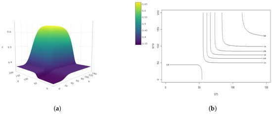 The class of extreme value copulas is particularly important among copula functions. This is because multivariate extreme value distributions can be obtained by using copulas with Unit Frechet margins []. In the case of bivariate analysis, the bivariate extreme value distribution denoted by with unit Frechet margins can be expressed as Equation (2):