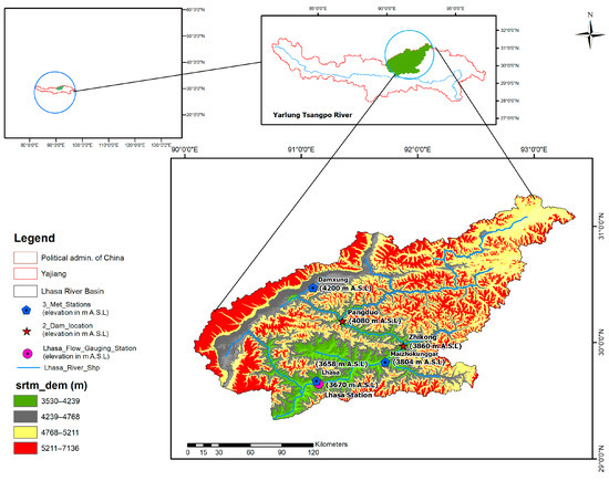 The Lhasa River Basin (LRB), ranging from 29°19′ to 31°15′ N and from 90°60′ to 93°20′ E, is the economical and authoritative center of the autonomous TP. The Lhasa River (LR) is the stretched tributary of the Yarlung Tsangpo River; LRB covers a ~32,321 km2 basin area (ArcSWAT-estimated area by the digital elevation model used in the current study), covering 13.5% of the total area of the Yarlung Tsangpo basin [60]. The LRB exhibits distinctive semi-arid monsoonal climate characteristics, where the major amount of received rainfall (~80%) is allotted to the summer season from June to September with the coinciding generation of peak LR discharge during the same time. The study of [61] showed that rainfall in summer is a dominant component in generating summer stream flow in the Lhasa River basin. As a result, the rainfall disparity poses an undeviating effect on the rainfall-dependent runoff generation process in the basin. The hydrological and meteorological archives for the LRB are retained at the Pondo, Tanggya, and Lhasa hydrometric stations and the Damxung, Maizhokunggar, and Lhasa meteorological stations, respectively, presented in Figure 1.