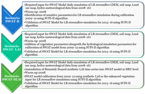 The motivation behind carrying out the scenario-based SWAT modeling of LR streamflow in the current study is the depiction of the influence on the simulation process by the addition of vegetation data into the hydrological simulation process as this information can be a vital input for the improved hydrological representation of LR streamflow obtained at the basin’s outlet. The detail of the scenarios developed for the current study is as follows.