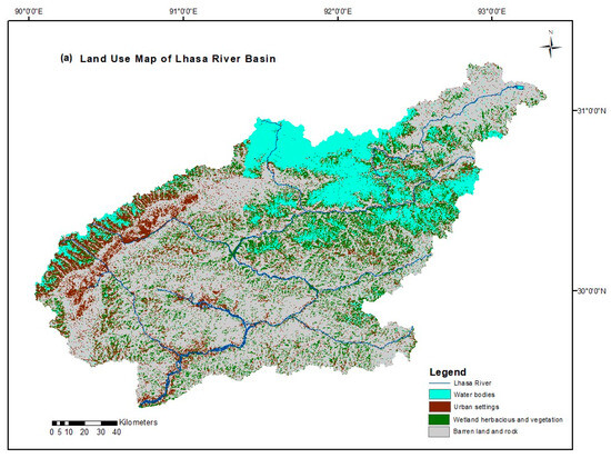 The LR has been experiencing some key hydraulic interferences in the form of reservoir development and impediment during the preceding and current decades. The chief hydraulic amendments in the study area are the setting up of Zhikong and Pangduo hydropower stations (Figure 1) over the LR. Having a typical temperate steppe ecological setting, the semi-arid monsoon climate is exposed to an annual average temperature of 7.7 °C owing to the high elevation and a mean annual precipitation of 440 mm. LRB is well vegetated with alpine meadow, alpine steppe, marsh, shrub, forest, etc. [62]. The source area of Lhasa River (LR) belongs to pastoral area, while the middle and downstream areas are farming–pastoral areas, respectively [63].
