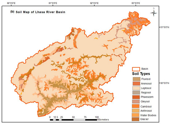 Figure 3. (a) Land use map (upper) showing the land use classes; (b) soil map (lower) showing the soil types in the Lhasa River Basin. - (c)