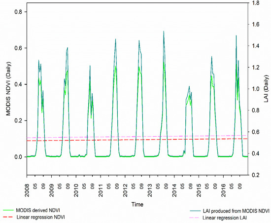 The MK test has revealed a surprising trend in vegetation and meteorological parameters of LRB for the daily time scale during the years of 2008–2016, as presented in Table 3. The baseline NDVI and the daughter LAI time series is experiencing a nonsignificant decrease with a change equal to zero per day (as per Sen’s estimator). The daily average temperature and rainfall has been experiencing a nonsignificant increase in the area. The study referred to as [102] has investigated the NDVI variation in LRB by applying a zoning technique where the LRB has been spatially divided into zones based on human interferences and climatic changes in the area. Their study has concluded that the deviations in NDVI compelled by climatic elements merely engaged 16.19% of the total river basin and has identified a greater impact of P than that of T on vegetation growth in LRB. Additionally, for approximately 70% of the area in LRB, vegetation growth was not subjective to climatic factors, hence, specifying the more recognizable human impacts. Land use alteration from cropland/grassland into urbanization is designated as the cause for the decrease in NDVI [102].