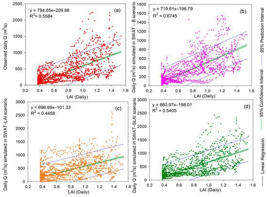 Many studies have already agreed on the integration of vegetation-based parameters in the hydrological distributive and rainfall–runoff models. Studies show that vegetation processes have major effects on runoff produced by controlling vegetation evapotranspiration and influencing soil moisture conditions [112,113]. Coupling the SWAT model with the remotely sensed (MODIS) LAI product has been applied for enhanced modeling of tropical and subtropical green vegetation dynamics and crop arrangements in semi-arid regions [56,58]. The enhancement of SWAT in these studies was assured by the remotely sensed LAI, which could precisely apprehend a more genuine plant phenology and configuration at a higher resolution [111]. Even though remotely sensed LAI is an indirect measure, it is nevertheless considered a better estimate than standard LAI [114]. In agreement to the findings of these studies, in the current study, the original SWAT model was nurtured with high-resolution physically authenticated vegetation conditions of LRB and has resulted in a visibly improved depiction of LR cumulative streamflow at the basin’s outlet. The synthetic LAI has been recognized as the pivotal representative of vegetation features of LRB in the improved hydrological simulation process. On developing a relationship between synthetic LAI and the LR discharge recorded at the basin’s outlet, the SWAT-B scenario simulated, the SWAT-LAI scenario simulated, and the SWAT-SLAI scenario simulated presented in Figure 6, we see an almost similar conduct of synthetic LAI towards the different LR streamflow data, where a majority of the values are enclosed within the 95% prediction intervals.