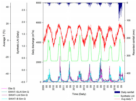 - The scenario for the simulation of LR cumulative streamflow, where the LAI time series developed by using remotely sensed data products is dispensed into the SWAT model, replacing the default LAI values estimated by SWAT for LRB. As the LAI time series was prepared from the remotely sensed vegetation data of LRB, this particular scenario is represented as the SWAT-synthetic leaf area index (SWAT-SLAI) scenario.