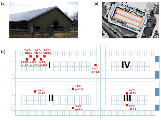 (a) Image of the reference dairy cattle barn (source: ATB, Potsdam); (b) sketch of locations for gas concentration, air temperature and wind speed measurements. Red (indoor) and blue (outdoor) lines indicate locations of gas sampling. The pink star marks the location of inflow measurements, while the yellow star refers to the location of air temperature measurements; (c) floor plan of the reference dairy cattle barn with the four groups of cows, as indicated in roman numerals. Group I and II consisted of about 120 cows each (I: second lactation or later, II: first and second lactation) and group III and IV consisted of about 70 cows each (III: late lactation stage, IV: early lactation stage). Sampling points for puddle pH and temperature are marked by red squares. The measured values of temperature and pH are noted next to the sampling position.
