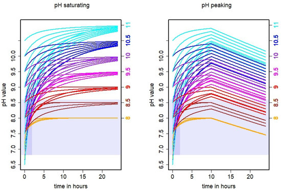 Simulated time series of urine puddle pH in dependence of assumed initial (left axis) and asymptotic pH values (right axis). Left: a saturating pH is assumed for the considered time frame, i.e., the pH tends towards the asymptotic value for 24 h, following Equation (3). Right: a pH peaking after 10 h is assumed, i.e., the pH value increased for 10 h and then exponentially decreased, following Equation (4). In both cases, curves of the same colors refer to the same asymptotic pH values. The shaded area indicates the range of pH values that were measured in the reference dairy cattle barn. The darker shaded stripe refers to the most likely age of the puddles during those measurements.