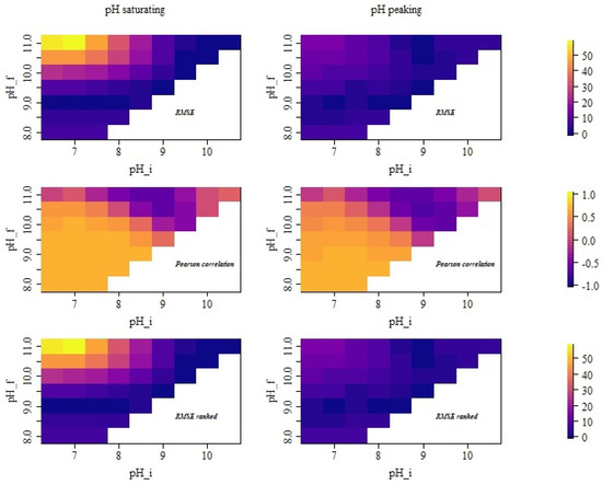 RMSE of NH emission (kg day per cow as averaged over all groups) and correlations assuming different urine puddle pH dynamics, with and referring to the initial and asymptotic pH value assumed in the simulation. The left panels refer to the saturating case assuming no decrease in pH in the first 24 h (i.e., pH follows Equation (3) for the whole simulation time). The right panels refer to the peaking scenarios assuming a decrease in pH after 10 h (i.e., pH follows Equation (3) for 10 h and then follows Equation (4). The upper panels show the distribution of the calculated RMSE of the simulated emission time series with respect to the experimentally derived emission time series. The middle panels show the Pearson correlations of the same set of time series. The lower panel shows the RMSE considering rank-ordered time series (i.e., the RMSE when comparing only the distribution of values, neglecting any temporal relation).