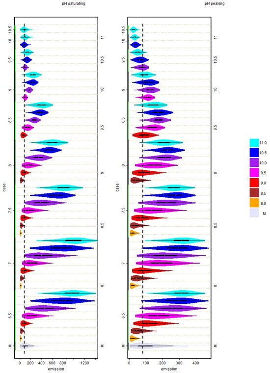 If a decrease in pH after 10 h was considered, the overall emissions were increasing. In order to account for this effect, the assumed cleaning efficiency was adjusted in the simulations (i.e., cleaning was assumed to be more efficient, which is reflected in the model by a smaller value of the correction factor for the emission active surface ). Afterwards the distribution of emission values, RMSE and correlations show in general similar trends as in the previous simulation cases with saturating pH. The main difference in the scatter plots is that in the cases with peaking pH, the spread is much lower, particularly for high values (cf. Figure A1 vs. Figure A3). This reduced variability is also observed in the violin plots (cf. left vs. right panel in Figure 4). For most pH combinations (except for the very high initial pH values), the tendency for overestimation was lower in the cases with peaking pH (cf. also Appendix A Figure A3 and Figure A4). High correlation and low RMSE were particularly found for lower pH values with being up to a value of 9 (see Figure 3 right panels). A particularly low RMSE was observed for the parameter combination and (for which was tuned) but also for the combination and , the combination and and the combination and . The mentioned combinations with , however, were associated with an anti-correlation between the simulated and measured emissions. The best correlations (i.e., values of about 0.64) were obtained for the simulation cases with and all considered as well as with , and , . The range of observed correlation values for the simulations with non-monotonic pH dynamics was very similar to the set of simulations with saturating pH. At the same time, the maximal observed RMSE was much lower for the non-monotonic pH dynamics (cf. Figure 3).