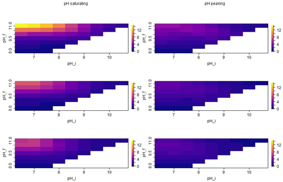 When varying and and fitting Equation (3) to the 12 puddle samples, we obtained average values for the parameters: , , = 0.81 h and = 0.19 h. The actual parameter values for each combination of and are listed in Table 2, and the resulting theoretical time series of the pH values are shown in Figure 2. The determined parameter value for varied between and with a median of and a standard deviation of . For parameter , it varied between and with a median of and a standard deviation of . The derived alkalizing rates varied between 0.50 h and 6.33 h for and between 0.10 h and 1.03 h for . The associated medians were 0.50 h for and 0.10 h for . The associated standard deviations were 1.08 h for and 0.21 h for . It turned out that with the estimated parameters, of the simulation cases did not reach the asymptotic pH value after 10 h. After 24 h still, about of the pH values were below the assumed asymptotic pH value.