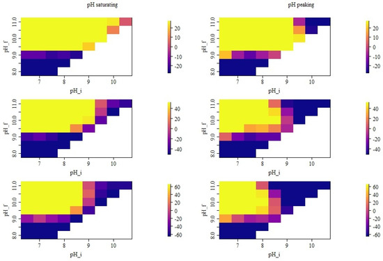 As shown in Figure 5, the relative deviation of the simulation from the measurements became typically larger when the deviation between and was increasing. Moreover, the deviation from the measurements was largest when low values of were combined with high values of . Both effects were less pronounced when the pH was decreasing after 10 h compared with a saturating pH assumption. Overall, the largest relative deviations were observed in winter. In Figure 6, the absolute deviations between the simulation and measurement were plotted for all pH combinations and showed a relative deviation of less than ±40% from the measurements. It can be seen that considerable overestimation and underestimation can be found for some pH parameter combinations and seasons.