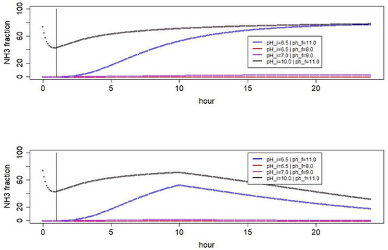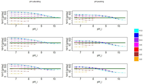 In contrast, when the maximum pH was high but the initial pH value was much lower than 10, the drop in total ammoniacal nitrogen concentration occurred later and was less sharp in the simulation. In those cases, there was no considerable intermittent increase in the total ammoniacal nitrogen concentration. Considering the whole 24 h period of integration, the total ammonia emission was higher for the lower initial pH values than in the case of the very high pH.