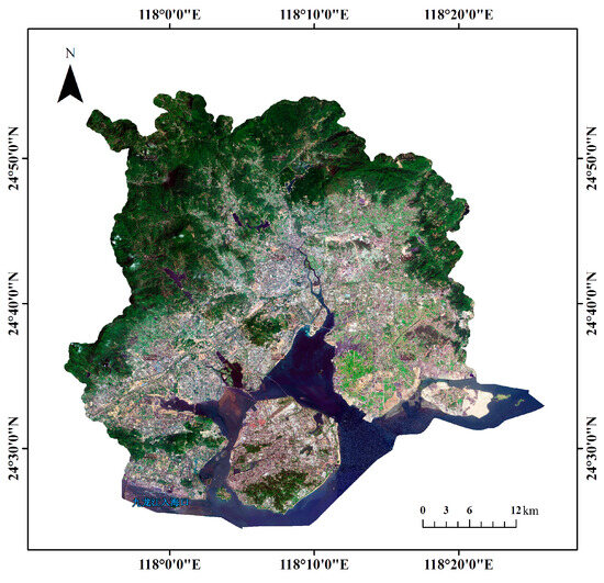 Xiamen (117°53′–118°26′ E, 24°23′–24°54′ N) is located in the southeast of China, covering a total area of 1699.39 km2. The altitude is 63.2 m (Figure 1). Xiamen has a subtropical maritime monsoon climate with concentrated precipitation and warm temperatures. The resident population of Xiamen has increased from 1.89 million in 1995 to 4.29 million in 2020. Xiamen is characterized by a high degree of intensive human activities that consume considerable amounts of food and energy. With excessive nitrogen inputs, nitrogen pollution has grown more serious. Xiamen’s booming economy and rapid urbanization have changed its land use distribution. In 2020, the urban residential land, industrial land, and transportation land accounted for 37.2% and were concentrated on the island; the most of forest land, agricultural land, and other land took up 62.8% of Xiamen, and these lands were extensively distributed in the surrounding areas. With the continuous acceleration of urbanization in Xiamen, the urbanization rate was elevated from 62.7% in 2005 to 89.4% in 2020. According to the results of monitoring surface water nitrogen concentration from 2004 to 2016, provided by the monitoring station of the Xiamen Environmental Protection Bureau, it was found that major rivers in the area had excessive levels of nitrite and ammonia nitrogen. Furthermore, from 1995 to 2015, the concentration of inorganic nitrogen in the nearby sea of Xiamen increased from 0.35 mg L−1 to 1.34 mg L−1 [28].