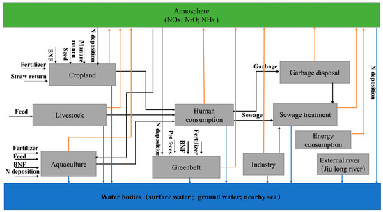 Different systems can generate varying levels of nitrogen that affect the environment in different ways. The systems that primarily affect water bodies include croplands, livestock, aquaculture, greenbelts, industry, sewage treatment, and garbage disposal (Figure 2). Moreover, Nr emissions from the above-mentioned systems also have a certain negative effect on the atmospheric environment. Nitrogen oxide emissions are increasing, notably in economically developed areas. In this study, NOx, NH3, and N2O emissions were considered the main gaseous Nr forms in the atmosphere. In general, systems that exerted a certain effect on the atmosphere comprised croplands, livestock, aquaculture, greenbelts, sewage treatment, and garbage disposal. The calculation formulas for the nitrogen flow and Nr emissions of each system are detailed in the Supplementary Materials (Equations (S1.1)–(S11.2)).