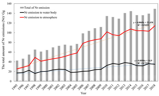 Human activities have a considerable impact on the water and air environments of a city, with varying effects depending on the amount of Nr produced. Analysis of time series data reveals that the release of Nr into water bodies and the atmosphere undergoes unique changes with the process of urbanization (Figure 3). By estimating the Mann–Kendall test and Theil–Sen’s slope estimation at a 99% confidence level (Z > 2.58, p < 0.001) (Table 1), we found that the total of Nr emissions from anthropogenic activities tended to increase significantly, going from 42.6 Gg in 1995 to 149.2 Gg in 2018. Moreover, the amount of Nr released into the atmosphere far exceeded that released into water bodies. Nr loads released into water bodies tended to fluctuate, increasing from 17.2 Gg in 1995 to 35.1 Gg in 2018, with an average annual increase rate of 3.1%. On the other hand, Nr loads released into the atmosphere increased from 25.4 Gg in 1995 to 114.2 Gg in 2018, with an average annual increase rate of 6.7%. The Nr released into the atmosphere accounts for over half of the total Nr emissions resulting from anthropogenic activities.