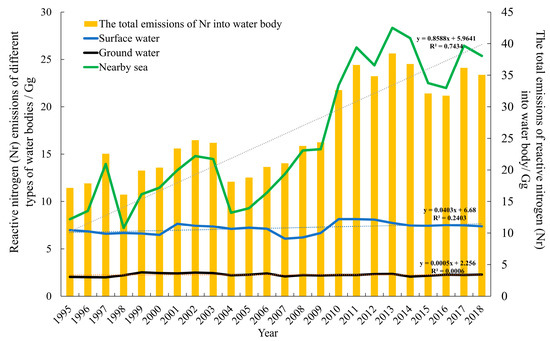 In general, the water bodies in this study comprised surface water, groundwater, and the nearby sea. All types of water bodies were affected by Nr emissions from different systems in the city, and the trends of Nr loads differed between the above-mentioned water body types from 1995 to 2018 (Figure 4). During urbanization, anthropogenic nitrogen (Nr) discharges exceeded those from natural sources, leading to severe effects on water body quality. By estimating the Mann–Kendall test and Theil–Sen’s slope estimation at a 99% confidence level (Z > 2.58, p < 0.001) (Table 1), the total Nr loads in Xiamen’s water bodies showed a fluctuating increasing trend between 1995 and 2018, with an average annual growth rate of 3.2%, increasing from 17 Gg to 35 Gg. While Nr loads in surface water bodies showed no significant changes during the period from 1995 to 2018, Nr loads in surface water bodies increased from 6.9 Gg to 8.1 Gg during 1995–2012 and decreased from 7.7 Gg to 7.4 Gg from 2013 to 2018. However, as Xiamen is a typical coastal city, Nr pollution in nearby seas became more serious. As the river upstream carried considerable Nr into Xiamen’s nearby sea, the Nr loads in nearby seas increased, from 8.1 Gg in 1995 to 25.4 Gg in 2018—three times higher than the Nr in surface waters and groundwater in this 23 year-period. Furthermore, most Nr pollutants originated from the upstream of the external river (Jiulong River).