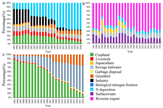 The results of this study revealed differences in the contribution ratios of various systems to the Nr loads in water bodies in the city; different water bodies were affected by Nr emissions from the respective systems. In addition, different characteristics and trends were displayed from 1995 to 2018 (Figure 5). Surface water bodies in the city were affected by various systems (Figure 5a). To be specific, the contribution of Nr emissions to surface waters from cropland systems decreased, from 20.2% in 1995 to 6.3% in 2018, marking a threefold decrease. Moreover, industrial systems contributed to 37.5% of Nr loads in surface water in 1995, which declined to 1.6% in 2018, with an average annual decrease of 4.5%. Furthermore, the contribution of livestock systems to Nr loads in surface water showed a gradual decline, with an average annual decrease of 3.6%. However, the contribution of N deposition to surface water progressively increased, and it emerged as a major source of Nr pollution in surface water. From a contribution ratio of 15% in 1995, N deposition in surface water rose to 65% in 2018, marking a 4.3-fold increase over the following 23 years.