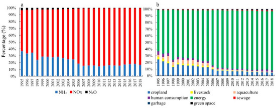 Additionally, there were substantial variations in gaseous Nr emissions among different systems (Figure 6b). From 1995 to 2018, Nr emissions from energy consumption tended to increase, becoming the primary contributor to Nr emissions in city ecosystems. Furthermore, Nr emissions from human consumption, sewage treatment, and garbage disposal systems also increased, although this increase was at a slower rate. In contrast, the aggregate amount of Nr produced by cropland systems tended to decline over the same period.