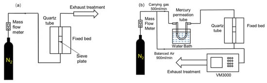 Test system diagram. (a) Fixed-bed biochar preparation system. (b) Fixed-bed mercury adsorption test system.