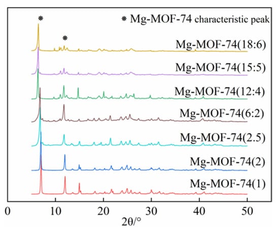 The XRD and SEM characterization results of Mg-MOF-74 samples under different preparation conditions are shown in Figure 2 and Figure 3, respectively. It was found that the XRD characterization results of all samples were roughly similar, and the characteristic peak of Mg-MOF-74 appeared in the vicinity of 2θ = 6.9° and 11.9° [13], which indicated that Mg-MOF-74 was successfully synthesized. When the mass-to-liquid ratio was constant with increasing solvent volume, the characteristic peak of the sample slightly shifted to a low angle, and the peak intensity also decreased. When the mass-to-liquid ratio increased, the characteristic peak of the sample shifted to a lower angle, obviously, the peak intensity decreased significantly and spurious peaks appeared, indicating that the crystallization degree of the sample had gradually deteriorated. Combined with the analysis results of pore structure (as shown in Table 2), it can be seen that the increase in solvent volume and mass-to-liquid ratio led to the deterioration of the pore structure of the Mg-MOF-74 obtained, mainly in terms of the decrease in specific surface area and pore volume, among which the influence of the mass-to-liquid ratio is more obvious. The results also show that Mg-MOF-74 synthesized by the solvothermal method can only be used for small-batch preparation but is not suitable for large-batch production. Combined with the characterization results, the Mg-MOF-74(1) sample was used as the raw material for the preparation of MOF-based composites.