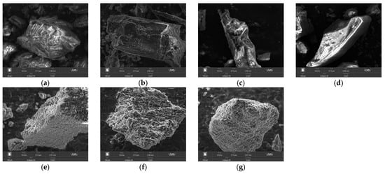 According to the synthesis methods of MOF composites in references [14,15], combined with the microscopic characteristics of Mg-MOF-74 and biochar, three composite preparation methods were proposed: co-pyrolysis method, sol–gel method and in situ growth method. As the co-pyrolysis method involved the physical mixing of Mg-MOF-74 and FeCeCu/BC, the physical mixing method was also studied as a composite method. The microscopic morphology of all the MOF-based composites synthesized through different methods is shown in Figure 4.