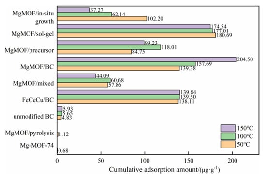 The influence of the adsorption temperature on the cumulative adsorption amount of the sample is shown in Figure 6. It was found that the performance of the samples formed by different composite methods for mercury removal was not fixed by the adsorption temperature. Among them, the adsorption amount of the unmodified BC and FeCeCu/BC increased slightly with increasing temperatures, but the change was not significant. For MgMOF/in situ growth, the mercury removal performance of MgMOF/in situ growth decreased sharply with increasing temperature. With increasing temperature, the mercury removal performance of MgMOF/mixed and MgMOF/precursor samples first increased and then decreased, and the adsorption amount of both samples was lower than that of FeCeCu/BC. The mercury removal performance of MgMOF/sol–gel decreased slightly with increasing temperature. The mercury removal performance of the MgMOF/BC sample can obviously be improved with increasing temperature, and both had higher adsorption amounts than FeCeCu/BC, which had better mercury removal performance.