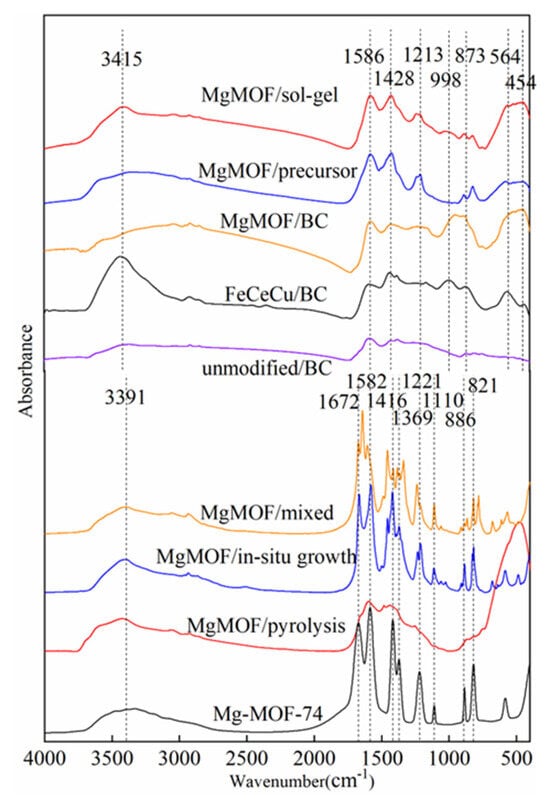 - In situ growth method: FeCeCu/BC was added to the Mg-MOF-74 precursor solution at a ratio of Mg-MOF-74: FeCeCu/BC = 1:1 and stirred for 30 min. The solution was placed in the reactor according to the synthesis method of Mg-MOF-74, and the resulting sample was denoted MgMOF/in situ growth.