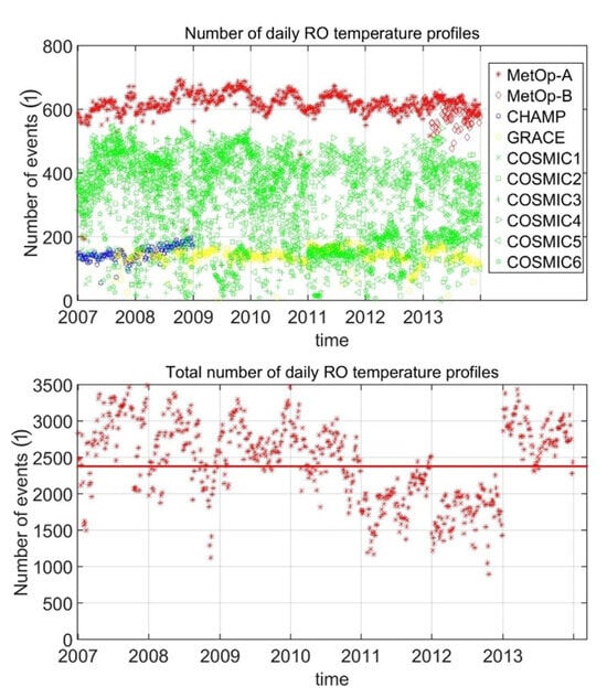 Upper panel: daily number of available RO profiles of different missions during our observation time from 2007 to 2013. Bottom panel: total number of RO profiles used.