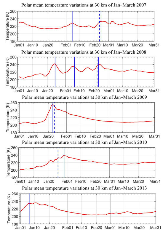 Temporal series of polar cap mean temperature anomalies at 30 km of January–March for years of 2007, 2008, 2009, 2010 and 2013. Blue solid vertical lines represent dates detected by our method based on temperature increases, while dashed vertical lines represent dates detected by wind reversal definition.
