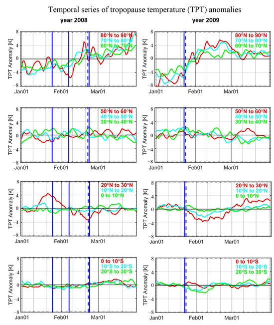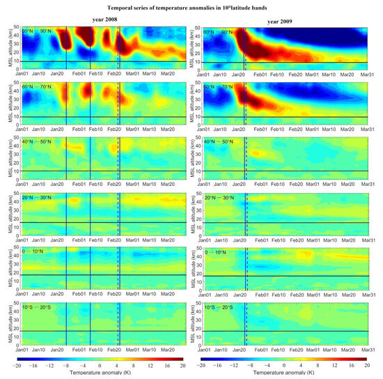 Figure 3 shows temporal series of temperature anomalies in selected 10° latitude bands from January to March of the years 2008 and 2009 illustrating displacement- and split-type events, respectively. In order to maintain the simplicity of this paper, results are only shown for every 10° band from 90° N to 30° S. Results of neighboring bands are similar overall. The horizontal black lines indicate the mean tropopause height from January to March of the bands.