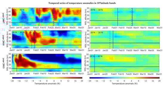 For the other years of 2007, 2010 and 2013, temperature anomalies of two representative bands, i.e., 80° N–90° N and 20° N–30° N, are shown in Figure 4. In the band of 80° N–90° N, all years reveal stratospheric warmings. For the year 2007, several warming pulses are detected and two of them pass our criteria, i.e., the 5 and 24 February ones. The latter one, i.e., the 24 February event, has strong downward influences on the mean tropopause level with temperature anomalies larger than 2 K. The SSW events occur in the years 2010 and 2013; they are both split events and have larger temperature anomalies, with values varying from 4 to 8 K and lasting for about 1.5 months. In the band 20° N–30° N, however, no visible cooling (temperature anomalies larger than −4 K) is detected below 30 km for all the three events.