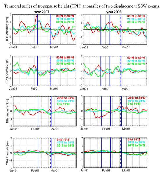 The third and the fourth rows show latitude mean TPH anomalies in the tropical areas of the northern and southern hemisphere, respectively. Variations in TPH anomalies are opposite to that in the polar region. For the year 2008, TPH anomalies of the 20° N–30° N band keep increasing after the first and second SSW events. The increases in TPH anomalies are mainly related to the propagation of equatorial planetary waves, which induces upwelling and cooling [53,54]. The cooling then penetrates further down into the tropical troposphere through the modification and deepening of convective activity in the tropical tropopause layer, subsequently increasing the TPH [5,51]. For the year 2007, TPH anomalies of the band 20° N–30° N also reveal larger variations than the rest of the sub-bands in the tropical region, while no visible trends can be seen related to the occurrence of SSW. This is because not all SSWs produce cooling in the equatorial stratosphere [55]. The responses of the tropical atmosphere to SSW events depends on the duration of planetary waves, the state of prior tropical atmosphere, etc. TPH anomalies in the other bands in the area from 30° N to 30° S are within ±0.2 km overall.