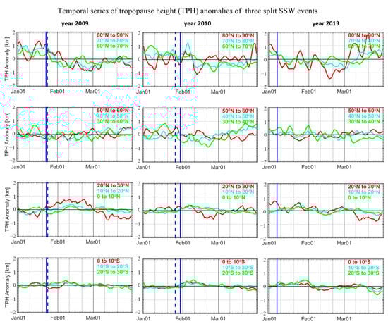 Figure 6 shows the same results as Figure 5 but for the three split SSW events that occurred in 2009, 2010 and 2013. The first row shows that characteristics of anomalies in these three bands are similar overall. For all three split events, TPH anomalies reveal a visible decreasing trend after the occurrence of SSW events. For the strong January 2009 SSW event, TPH anomalies increase to maximum prior to the onset date. After reaching maximum, TPH anomalies decrease until the end of February with a variation of 2 km during 1.5 month.