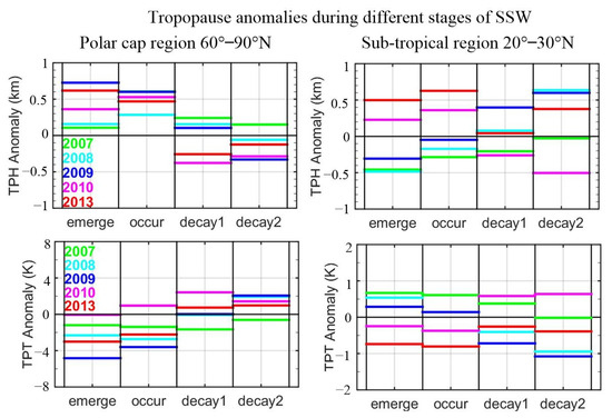 Figure 8 shows TPH and TPT anomalies during the four stages of all SSW events. Two representative bands 60° N–90° N and 20° N–30° N are selected. Results show that after the occurrence of the SSW events (from the occur to the decay1 stage), TPH anomalies of 60° N–90° N band show a visible decreasing trend for all selected SSW events, while TPT anomalies show an increasing trend. The duration and variations of the decreasing/increasing depend on the strength of each event and also the prior state of the atmosphere. Split events, which generally have stronger warming, can have stronger influences on the tropopause than the displacement events. For the year 2009, TPH anomalies keep decreasing during all four stages with a variation of about 1.0 km. TPT anomalies, in contrast, keep increasing during all stages with a variation of about 7 K. For the years 2013 and 2010, the durations of decreasing/increasing are shorter, with TPH anomalies being generally less than 1 km and TPT anomalies less than 4 K.