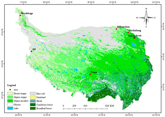 The meteorological station data used in this paper mainly come from the Qinghai–Tibet Plateau Data Center (http://data.tpdc.ac.cn/zh-hans/) (accessed on 2 September 2023), the China Alpine Surface Process and Research Network (http://www.horn.ac.cn/) (accessed on 2 September 2023); the datasets contain measured four-component radiation data [40,41]. According to the topographical features of the Qinghai–Tibet Plateau, a total of 7 sites which include the main land cover types in the Qinghai–Tibet Plateau were selected as verification data. The average altitude was above 4100 m. The land cover types in the Qinghai–Tibet Plateau are mainly alpine meadows, alpine grasslands and alpine deserts (Figure 1). Due to the fact that the number of surface temperature observation stations in the Tibetan Plateau region is not only small, but also shows the spatial distribution characteristics of dense in the east and sparse in the west, dense in the south and sparse in the north, only seven meteorological stations were selected in this study, and some stations with inaccurate radiation values and surface emissivities were eliminated in the process of selecting meteorological stations, so there are some errors in the radiation values and emissivities of the stations, which affects the accuracy of the model estimation. Due to the difference of monitoring time, the time interval of the Ali Station, the Muztag Station, the Nagqu Station and the Qilianshan Station is one day. The long-wave radiation of these four stations is the average value in one day. The time interval of monitoring the Dasharon Station, the Arou Station and the Yakou Station is 10 min, and the data with the station monitoring time interval of one day refer to the average value of long-wave radiation in one day, and the two have the same effect. Finally, 365 days of data in 2018 are used to verify Tdm (Table 1).