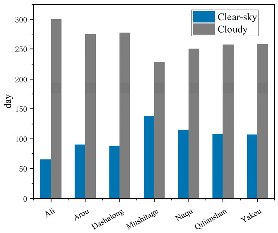 By comparing the number of clear sky and cloudy days in 2018 at seven sites on the Qinghai–Tibet Plateau (Figure 3), the clear sky condition implies that the four satellite transit times of the MODIS data are clear sky, and if one satellite transit time is not clear sky, it is cloudy. Therefore, when using the RTM model to reconstruct the surface temperature under the cloud in this study, reconstruction is not required only when the four satellite transit times are all clear skies, and the surface temperature needs to be reconstructed for other weather conditions.