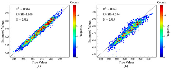 Density scatter plot of daily mean surface temperature estimated by the RTM-DTC method (a) and the arithmetic mean method (b). The dashed line is a 1:1 straight line.