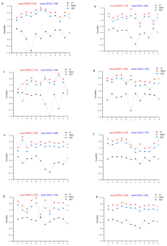 The results of the monthly scale error validation are shown in Figure 6, quantified using the three parameters R2, RMSE and MAE. Figure 6a–g shows the seven meteorological stations with scale error validation, respectively, and the average monthly scale RMSE is between 1.77 K and 2.0 K, which is lower than the daily scale. The average MAE is between 1.45 K and 1.76 K. Figure 6h shows the total error for the seven stations with the RMSE of 1.89 K and the MAE of 1.59 K. The error results in the figure show that the RTM-DTC model is sensitive to the seasons, and in general, the errors are lower in summer and winter, and higher in spring and autumn.