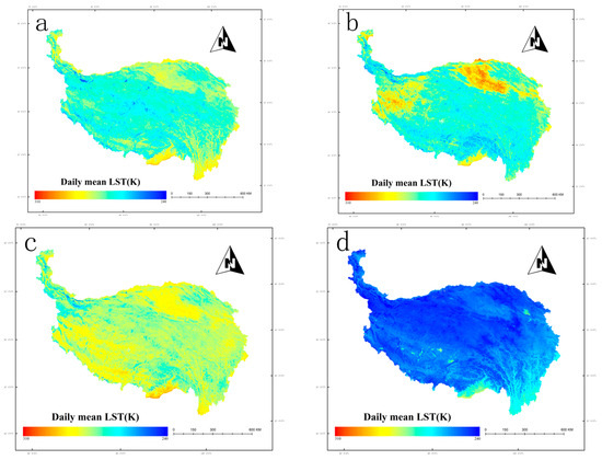 Spatial distribution of the average surface temperature on the Tibetan Plateau estimated by the RTM-DTC model ((a–d) represent Days 90, 180, 270 and 360 of 2018, respectively).