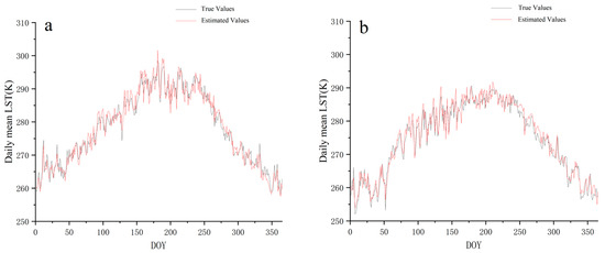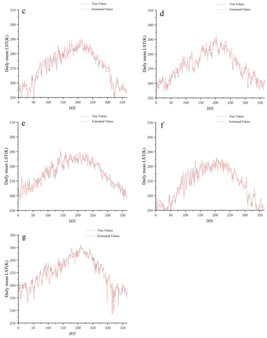 The information of the spatial distribution of the average surface temperature at days 90, 180, 270 and 360 for the Tibetan Plateau estimated by the RTM-DTC model (Figure 7) shows the overall annual trend of the average surface temperature in the Tibetan Plateau region. The average surface temperature at Day 180 is higher than at the other three time points, the average surface temperature at Day 270 is higher than that at Day 90 and the lowest surface temperature at Day 360 in the tie bureau. Figure 8 shows the annual variation curves of the average surface temperature at the seven site locations. The gray curves in the figure are the real values measured at the stations, and the red curves are the estimated values from the RTM-DTC model. The prediction results can basically describe the annual trend of daily surface mean temperature. As can be seen in the figure, the average surface temperature is highest around Day 200, reaching a maximum of over 290 K. The average surface temperature is lowest between Days 0 and 50 and 350 and 365, between 250 K and 260 K. Some stations may be lower, such as the Pass station, reaching even below 240 K.